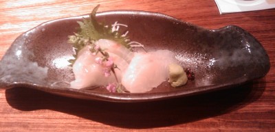 ビールで乾杯しつつ、鯛のおつくりと豆腐サラダをまずは前菜としていただきました。