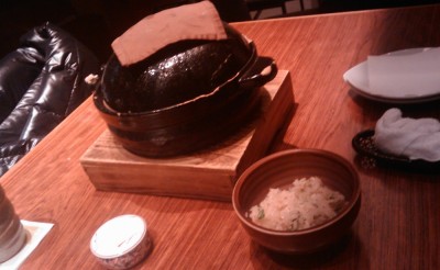 そして、本日のメイン(?)、蛸めしがやってきました。約2.5合をちゃんと土鍋で炊き上げてくれます。ちょっと2人じゃ量が多かったけど、これまたウマイ・・・