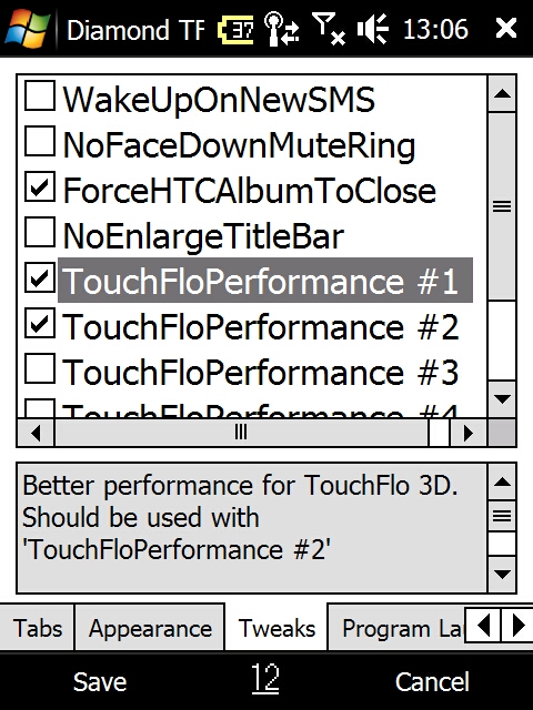 まずは、Diamond TF3D Config。簡単な UI 設定で本来レジストリを操作しないと変更できないような設定変更が可能です。Tweaks タブにある TochFloPerformance #1 と #2 を有効にして再起動すると、TF3D の感度というか、反応速度がググっと向上します。これをやるだけで使い勝手が相当良くなります。他にも各種設定があるのですが、この設定のためだけに導入しても価値があります。他にもプログラムランチャの並べ替えとかもできます。ってか、こんな機能はデフォルトで入れとけって感じですが・・・(通常だと、ボタンごとに登録と削除しかできません)。
