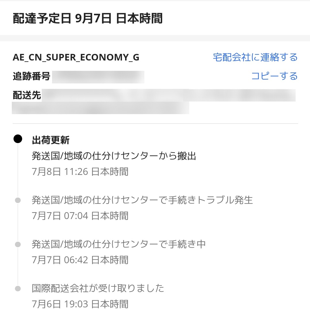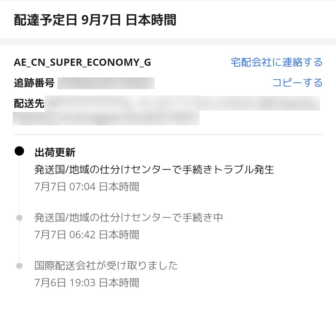 追跡情報のアップデートが来たと思ったら「手続きトラブル発生」という、今まで遭遇したことのないステイタスになっていました。