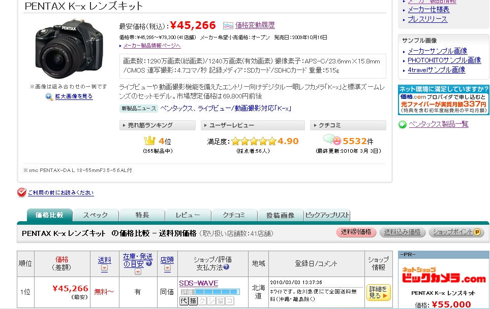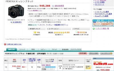 ここ毎日チェックしていた PENTAX K-x のレンズキット。価格下げ競争が 3/1 からまた始まり、3/3 お昼の時点で¥45,266まで下がっておりました。