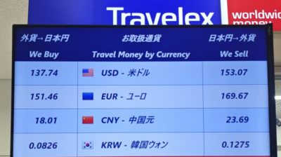 手持ちの USD は少々あったのですが、万一を考えて少量は両替しておくことにしました。昨今の円安進行と、為替のボラティリティの高さで悩ましい状況です。空港の Travelex だと・・・153円/ドルか。この日は148円前後で推移していました。