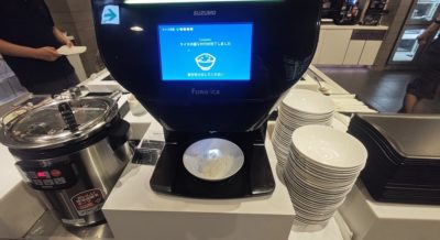 ご飯の自動盛り付け機がありました。左側のポットにはカレーが入っています。