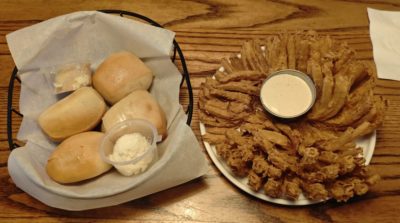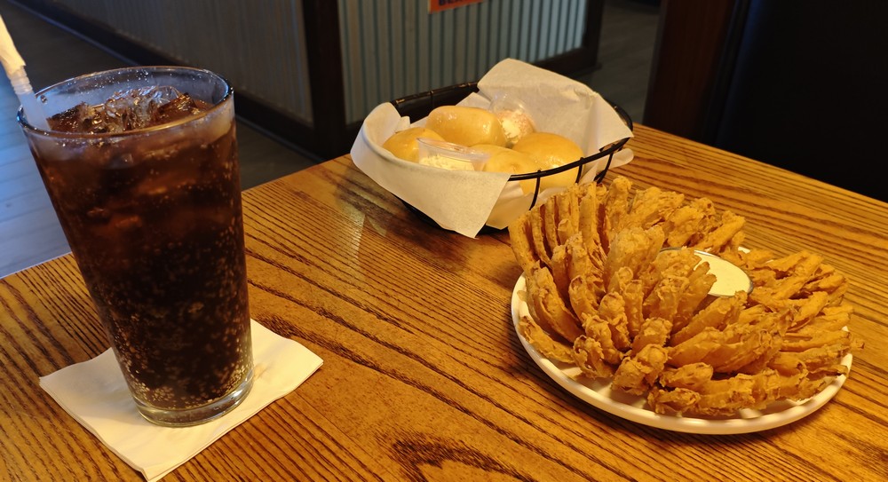 アペタイザーに TEXAS TUMBLEWEED。花のようにカットされたフライドオニオンです。巨大すぎて、二人でも食べ切れない感じ(笑)。ソースが美味いです。今回のドリンクはルートビア。本日はノンアルデーなのです。テーブルに着いた時に「ビールメニューはいるか?」と聞かれましたが、不要と答えました。
