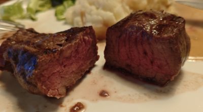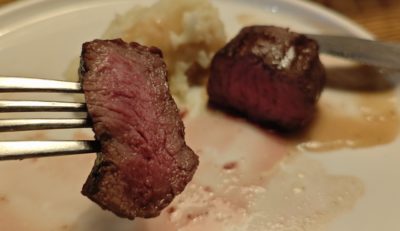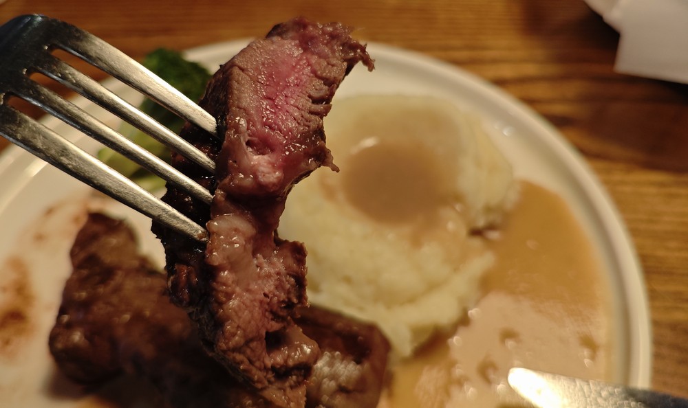 もう少しで食べ切るぞ・・・というあたりになると、お肉が冷えてきて最初の一口目の感動とは程遠い状態になってしまいました。普通のお皿でアツアツの鉄板じゃないので、ユックリ味わっていると後半お肉が冷たくなってしまうのです。12oz の量だったらもっと時間がかかって最後の方は残してしまいそうになるかも。良いお肉で好みの味付け。ボリュームも程よいのですが・・・最後までアツアツで食べられたら、もっと満足度が高かったかなぁ。