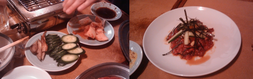 浅漬けはサービス。キムカクセットで箸休め。ユッケも新鮮で濃厚。