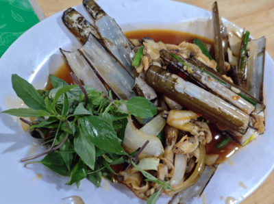 マテがい (nail snail) をハーフで。125,000VND です。コレは案外フツーの味。ちょっとピリ辛な味付けですが、美味しいです。確かに殻がツメみたいですな。