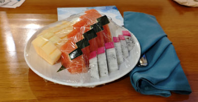 部屋に戻ったら、フルーツ盛り合わせが用意されていました。サービスらしいけど・・・さすがに全部は食べ切れません。少しずつつまんでから、シャワー浴びて寝てしまいました。ちなみに、朝までグッスリで、お腹が異常になることはありませんでした。やはり昨年の体調不良はこのお店が原因でなかったと言って良さそうです♪