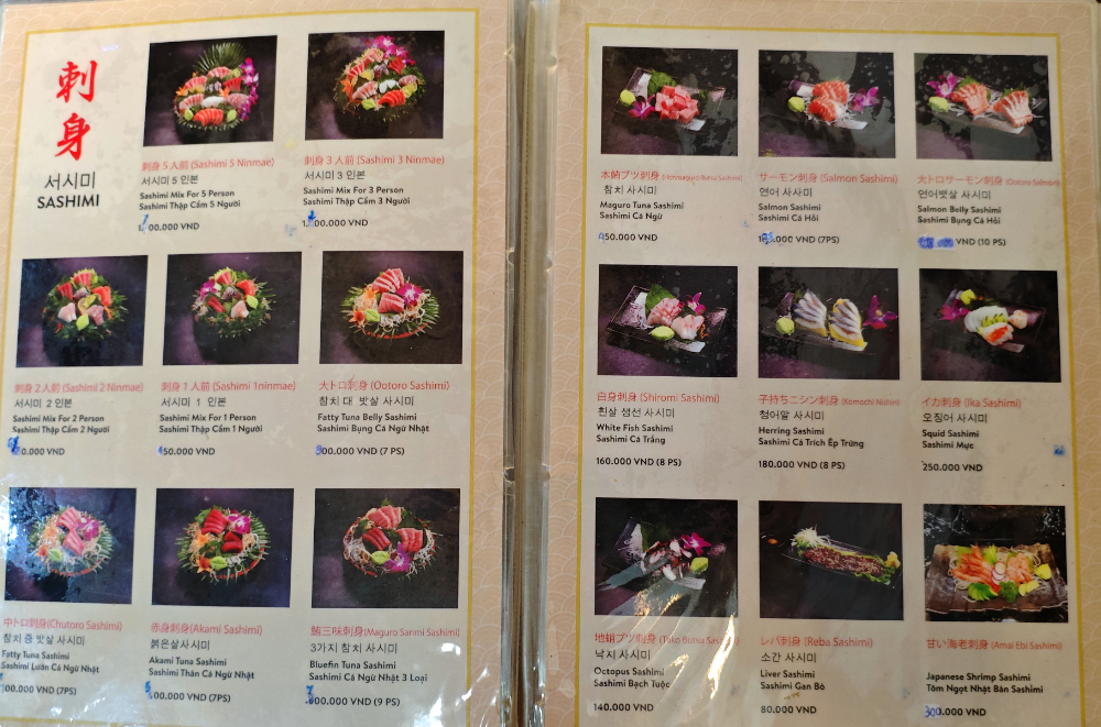そんなわけで・・・ベトナムで食べるお刺身を試してみます。2人前で 650,000VND なので、約3,600円。かなりの高級品。しかし、いずれも新鮮で美味しい。若干温度が高い(冷えてない)気がしないでもないけど、注文してからちゃんと切り分けて盛ってから出してくれます。もちろんこのお値段なら日本で食べた方が良いですけど、長期ベトナム在住とかなら、こういうお店で食べる和食は染みるかもしれません。