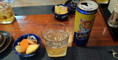 日本の居酒屋っぽくお通しが出ます。肉じゃがって、久々に食べた気がする。若干煮込みが浅いけど、普通に美味しい♪ 1杯目のビールはベトナムビールな LARUE で。やはり氷を入れて飲むベトナムスタイル。