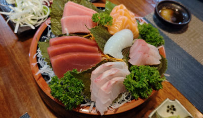 このお店、メニューがスゴイです。刺身だけじゃなく、寿司、焼き鳥、豚串、天ぷら、アジフライ、とんかつ、天丼、牛丼、カレーライス(笑)、鰻丼、すき焼き、そば、うどん、冷やし中華に長崎ちゃんぽん(笑)、各種ラーメンと、日本食を食べたいという場合は何でも揃う感じ。枝豆、牛タン、お新香や納豆といったオツマミも充実しています。餃子やチャーハン、天津飯といった若干日本関係ないものもあったりします。