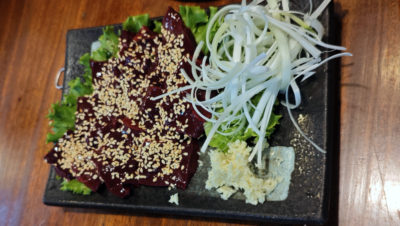 そしてT氏が心待ちにしていたのがレバ刺し。日本ではすっかりお目にかからなくなりましたが、こんなベトナムで食べて大丈夫なのか・・・不安がないわけではないけど、食べちゃいます。