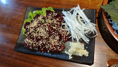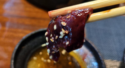 割と血が滴る感じ。でも角も立ってて新鮮そう。とても久々に食べたので懐かしい美味しさです。臭みもないし、素材は良さそう。ゴマ油に入っている塩が多すぎでしょっぱいのが難点(笑)。