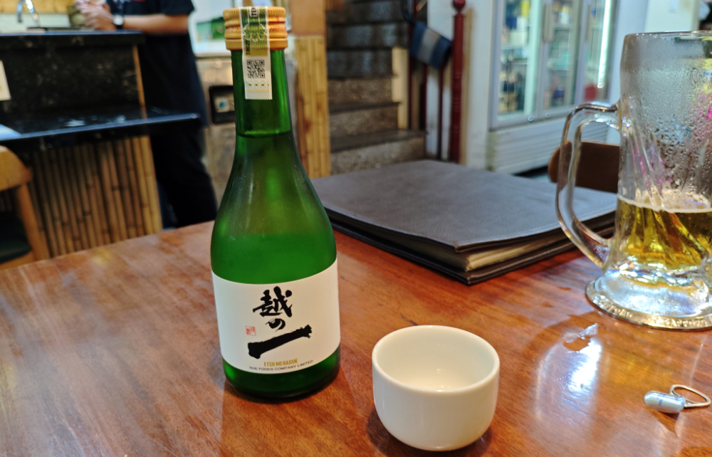 というわけで、ここからが本番。「越の一(えつのはじめ)」登場。300ml、720ml、1800mlと3サイズ用意されていまして、一応味見ということで一番小さな300mlを注文。160,000VND なので890円くらい。