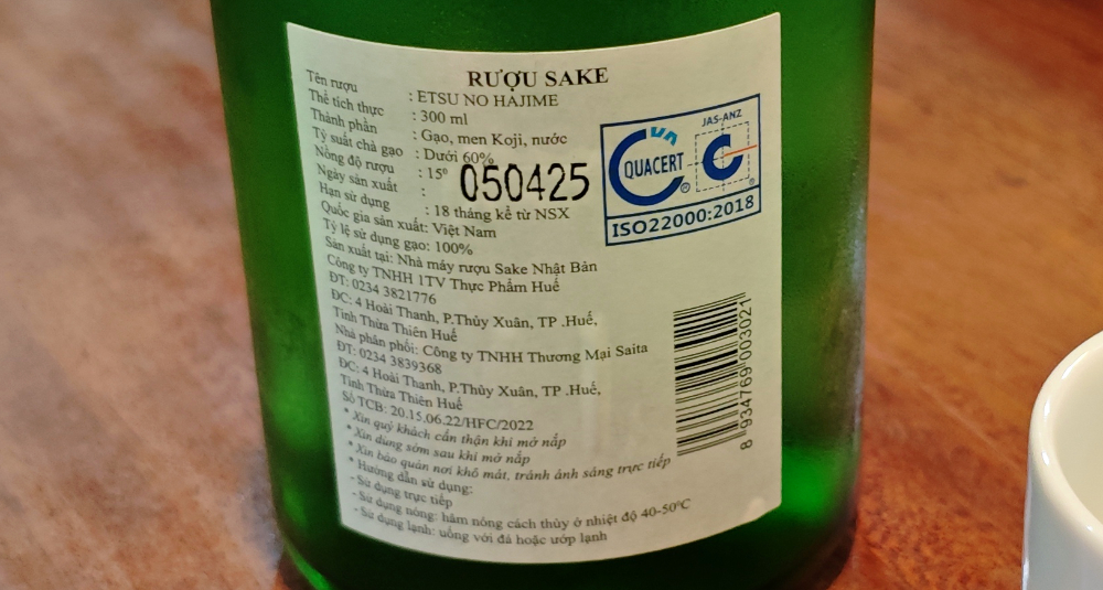 裏のラベル。完全にベトナム産っぽいです。お味は・・・ちゃんと日本酒。若干酸味があって、香りやお米の甘みは薄めながら、サッパリしてて飲みやすい。ちなみに、メニューにある「乾杯」も同じトコロで作っているベトナム産日本酒らしい。越の一が純米吟醸、乾杯が本醸造・・・かな⁉ ココがメーカーのページらしい。