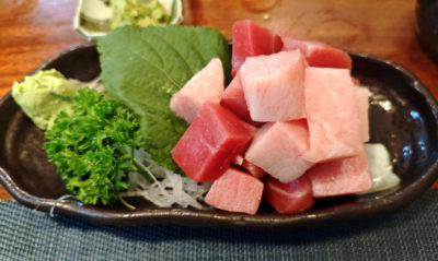 日本酒については、普段から良いヤツばかりを飲んでるワタシとT氏なので、越の一はホドホドにして、美味しかったお刺身を追加オーダー。特にマグロが良かったので本マグロぶつ切り。450,000VND は2,500円。個人的には中トロな白い方より、赤身(でも結構トロトロ)の方が好み。山葵がもうちょっと頑張ってくれると嬉しいかなぁ。