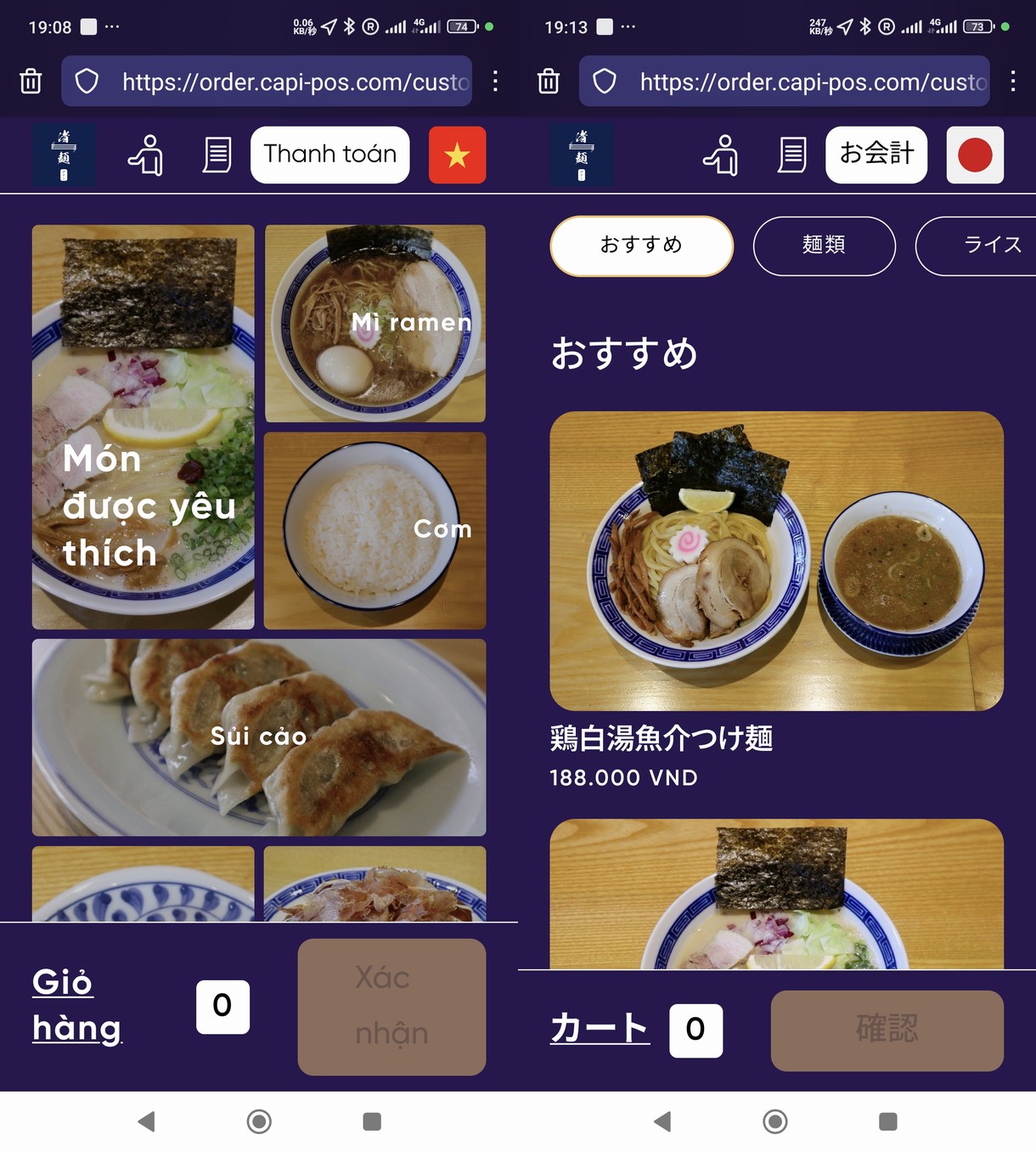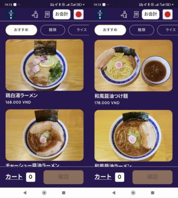 最初はベトナム語なメニューですが・・・言語選択で日本語化も可能。オススメのトップは鶏白湯魚介つけ麺らしい。