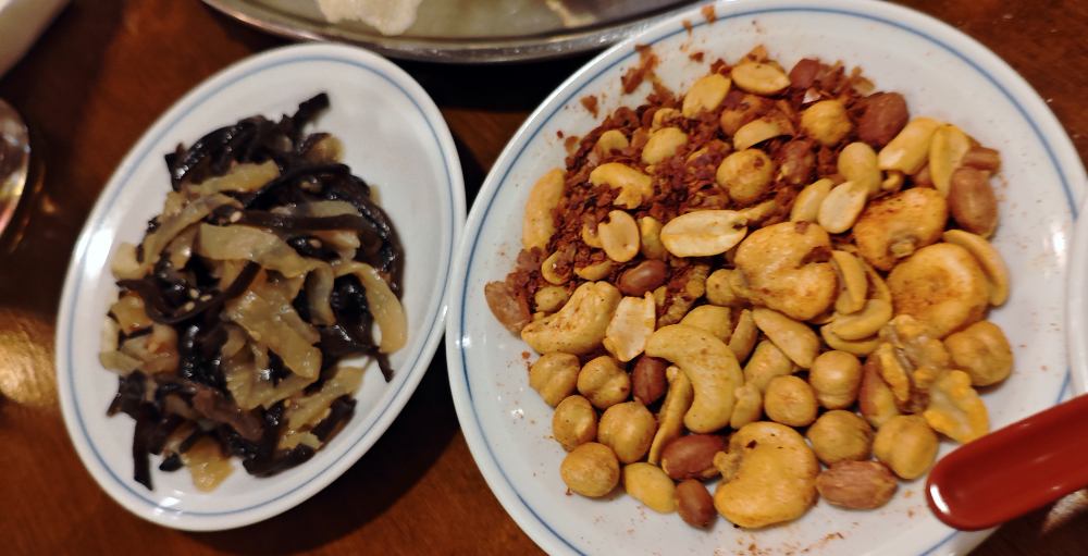 中華クラゲの和え物と麻辣ナッツ。若干似たようなモノが連続する(笑)。
