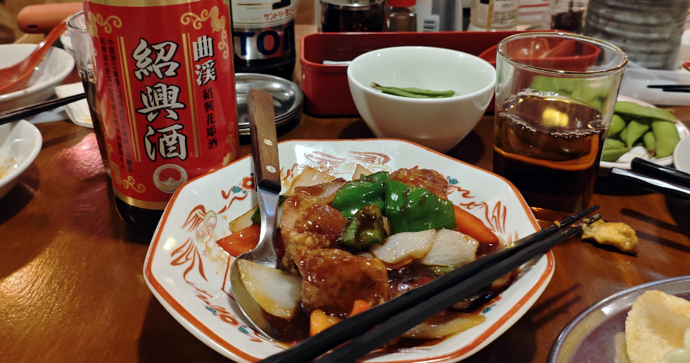 酢豚が出る頃には・・・紹興酒モードに。飲み放題のヤツなので、あまり美味しい紹興酒じゃないけど、デカ目のコップでガンガン飲んでしまいました。