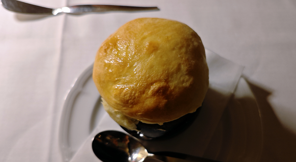 マッシュルームが入ったクリームスープのつぼ焼きパイ包み。コレは結構お腹にたまります。