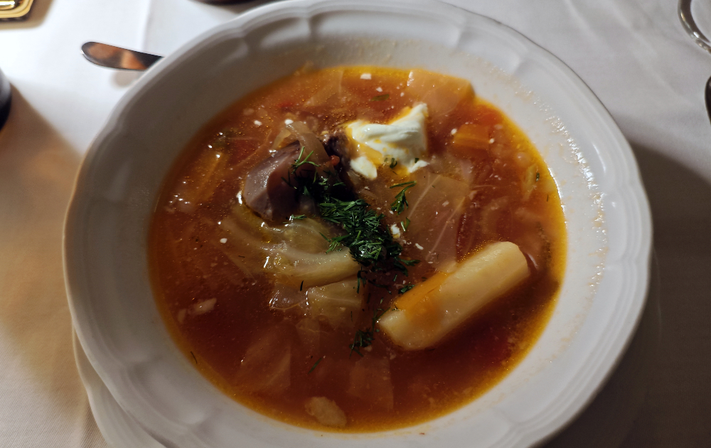 ロシア料理といえばなボルシチ。サワークリームがアクセントですな。