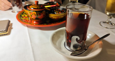 最後はチャイ。コーヒーとの2択で普段ならコーヒーとするところですが、ロシア料理なら〆はチャイですよね。色々なジャムと合わせつつ飲むロシアンティーは、なかなか雰囲気あって良いです。