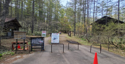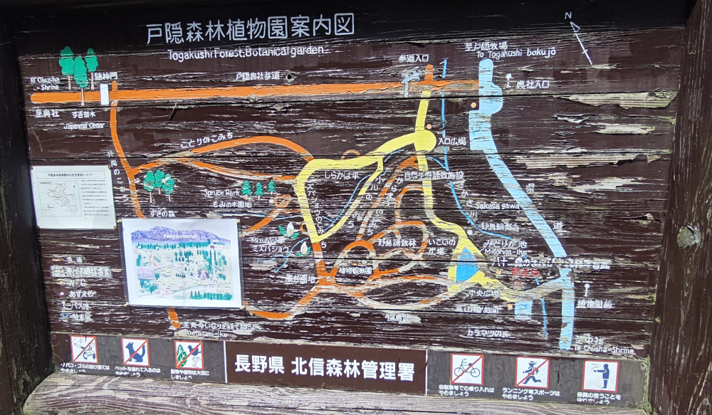 何十年も戸隠を訪問しながらも、実は一度も来たことがない戸隠森林植物園というトコロに行ってみようということになりました。調べたら入場料とかないらしいし、季節的にもお散歩して腹ごなしするにはちょうど良いかな・・・ということで。奥社前と違って駐車場も無料。いざエリアに入ろうとすると「クマ注意」の看板がお出迎え。