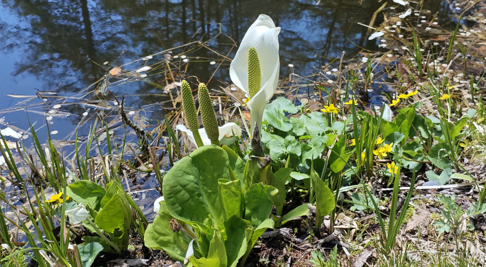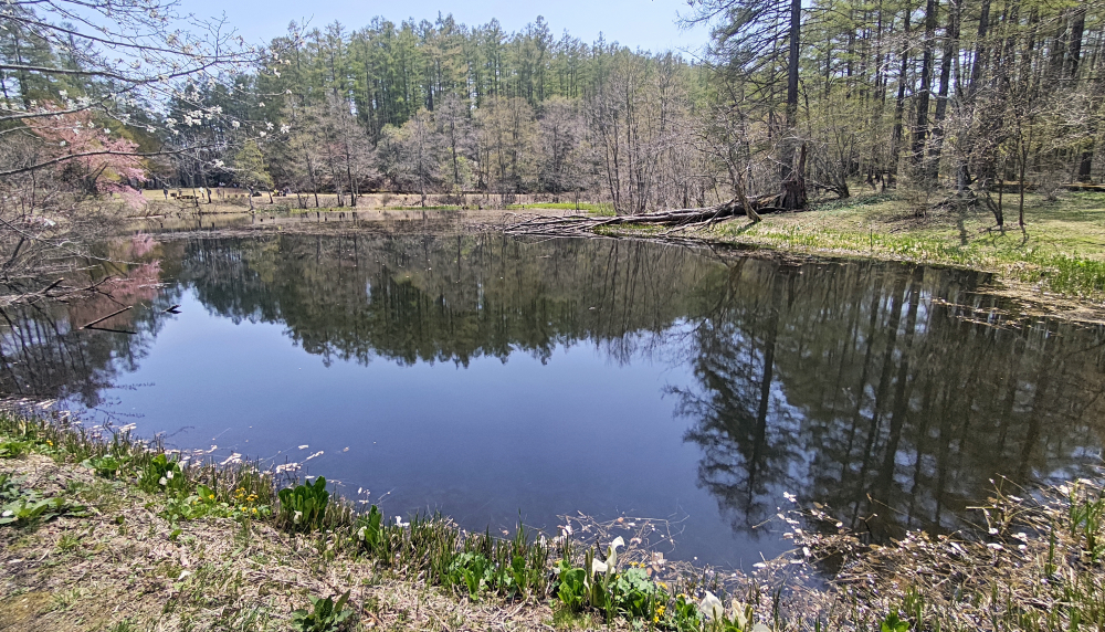 池の岸付近ではチラホラと水芭蕉が咲いていました。標高高いトコロなのでシーズンには少々早いかとおもったら、見頃と言っても良いほどでした。