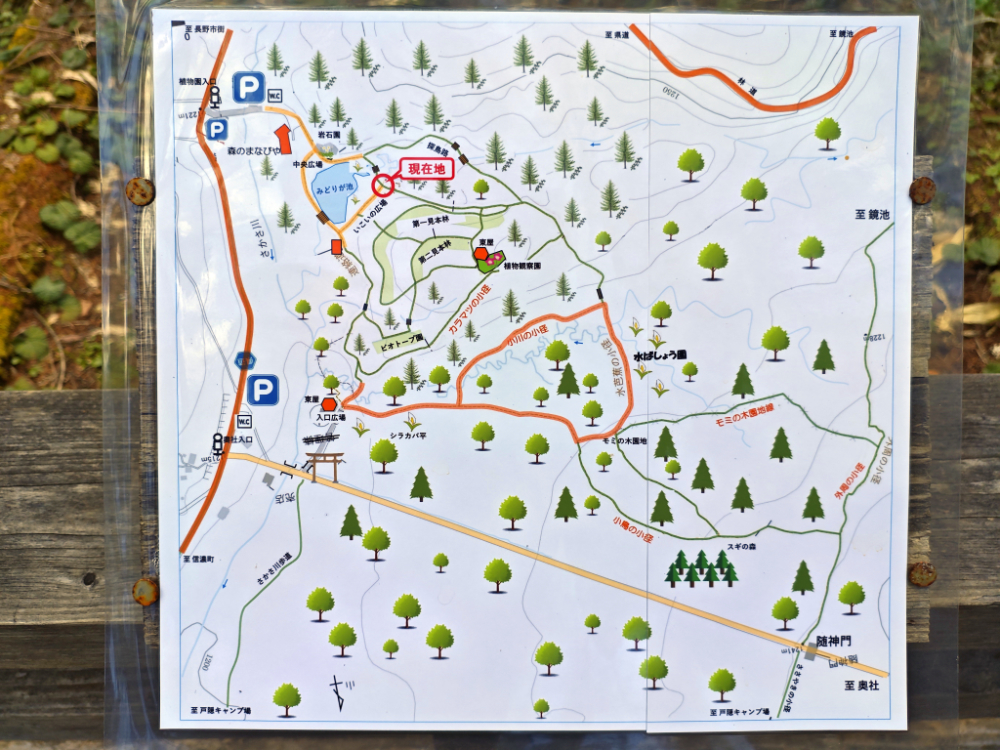 池の周囲を散策していたら、途中に詳細な地図が掲示されていました。コレ・・・もっと早く見たかったです(笑)。奥社参道の入り口まで歩いてもそれほど遠くなさそう。最近は奥社前の駐車場も値上げが激しいので、今後はココに駐車してから奥社目指しても良いかも。ココにある MAP でおおよその時間も把握できますな。奥の方まで進めば水芭蕉園があるっぽいけど・・・