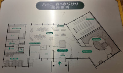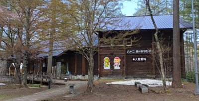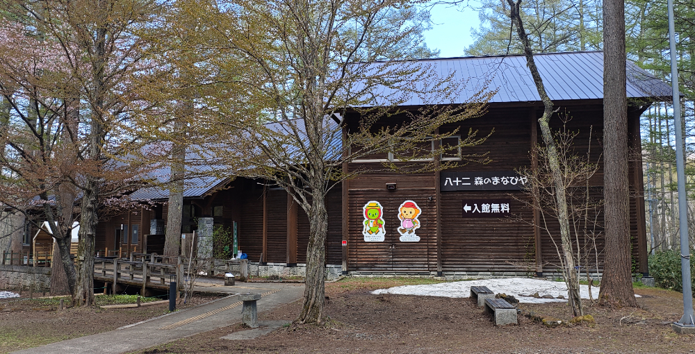 池をグルリと1周して、広場まで戻ってきました。駐車場近くにある建物は「八十二 森のまなびや」というらしい。入館無料で何やら展示があるというので、入ってみることにしました。