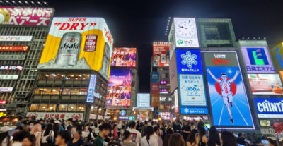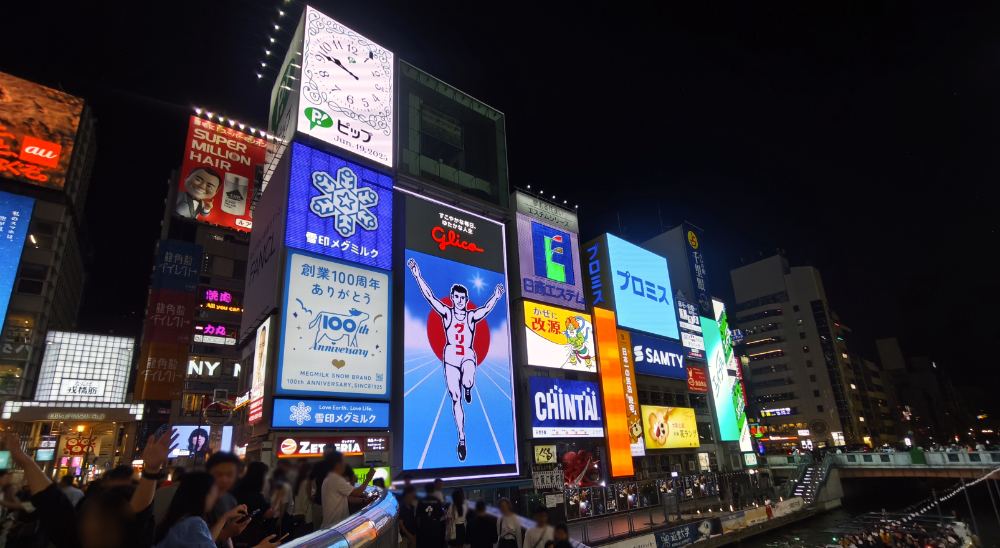 夜の道頓堀付近を散策。かなり人が多いです。大観覧車があるドンキ前で360度撮影。こうした密集したエリアだと360度撮影は役立ちます。HDR 撮影で結構綺麗に夜景が撮れるようになったので、やはり Insta360 X3 導入は効果アリですな。