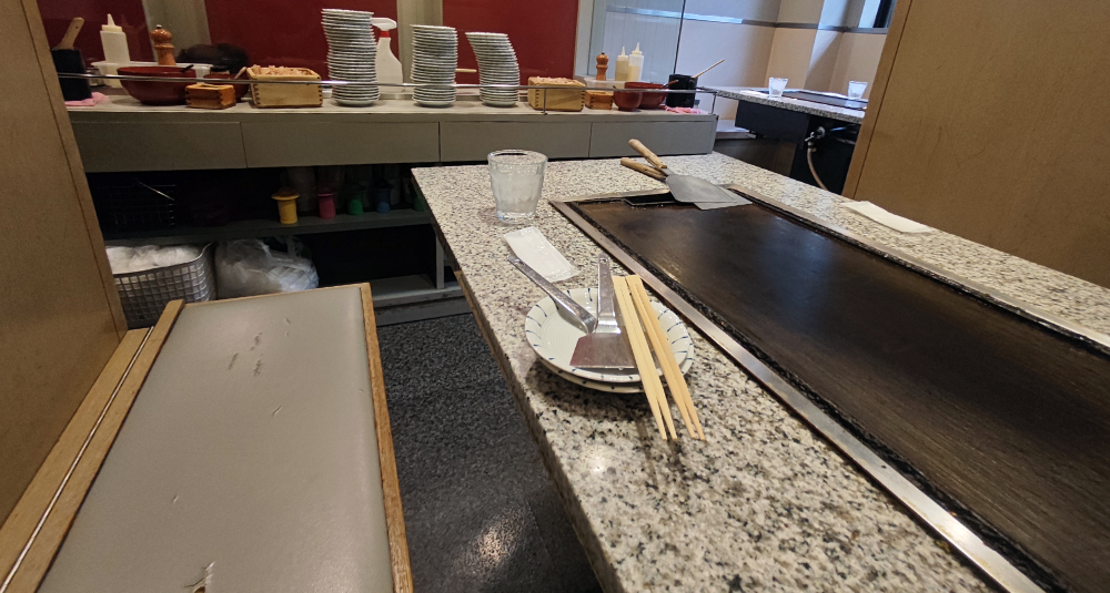 待っている間にオーダー済なので、すでに準備が整っています。テーブルに鉄板がありますが、基本的にスタッフさんが作成してくれます。