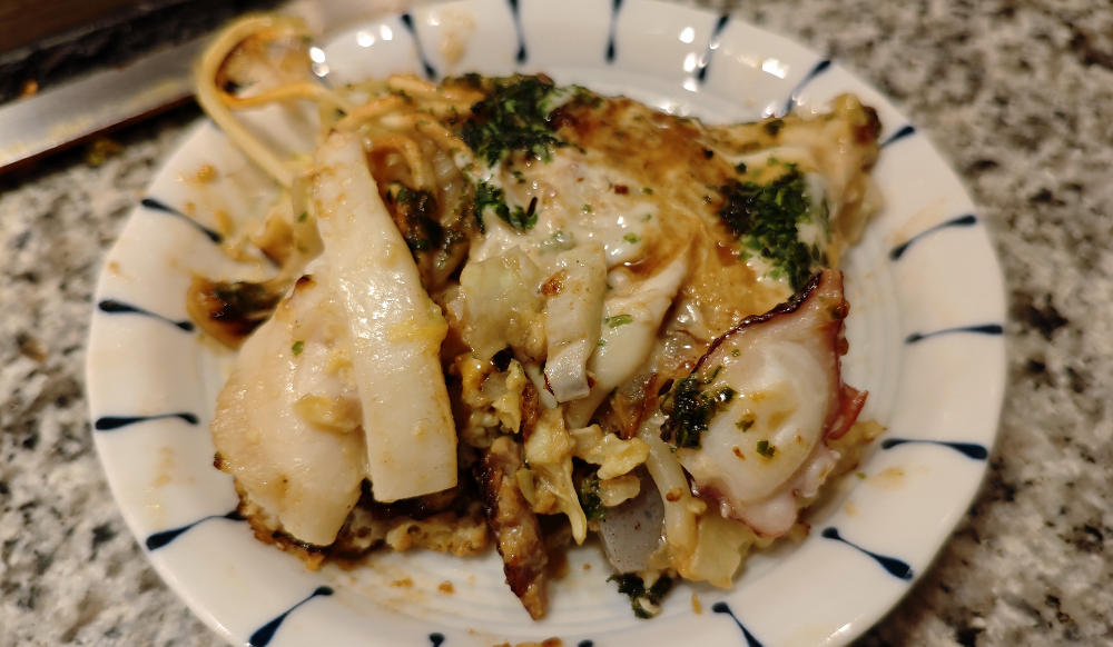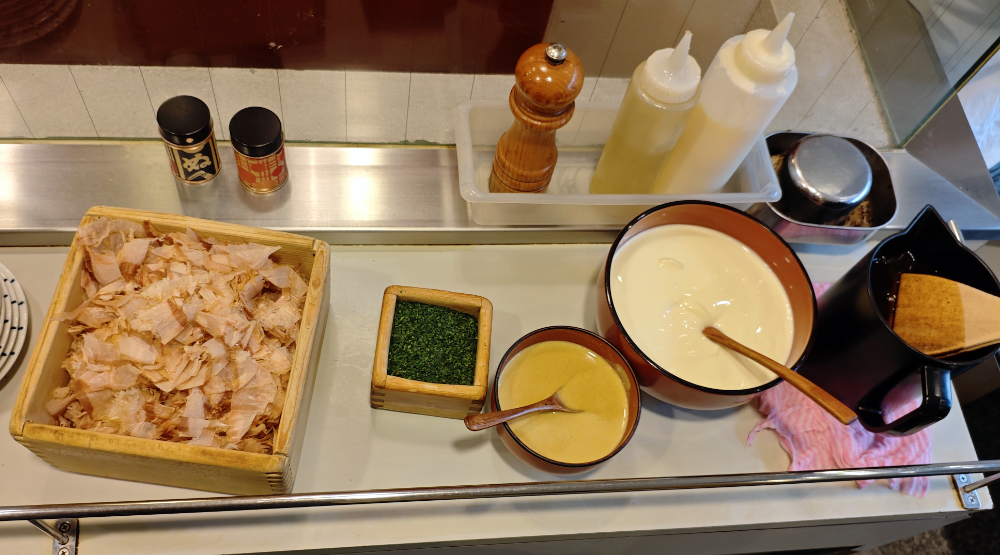 豚、いか、海老、タコ、貝柱、特製ミンチ肉の6種類らしい。生地を感じる暇がないほど、具材の主張が強め。粉モノとして、もう少しベースの旨味を味わいたかったが、ハフハフ言いながら食べてたら、あっという間になくなりました(笑)。