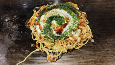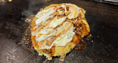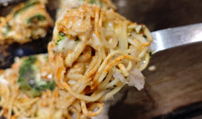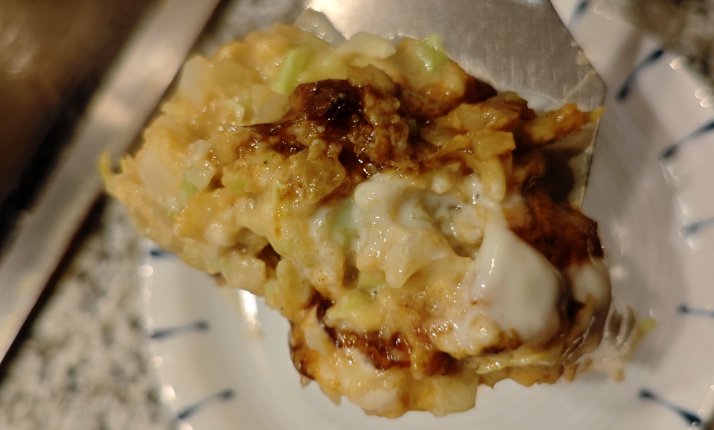 フワフワでトロトロです。ソースやマヨネーズもそれなりに強いけど、出汁の味もシッカリ感じますな。とはいえ、猫舌なワタシはこの手のアツアツな食べ物の味の理解は苦手(笑)。大き目なエビと貝柱と、刻んだキャベツは良くわかりますが、豚バラやイカも入っているらしい。