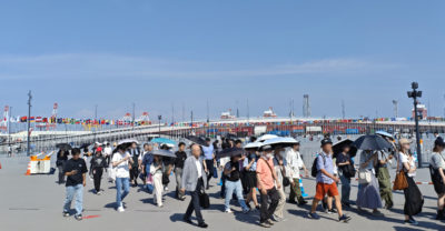 駅を出てから入場ゲートは近そうなのですが・・・グルリと周囲を大回りさせられます。きっと混雑時を想定した人流制御なのでしょう。周囲に並ぶ万国旗がなかなか壮観です♪