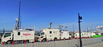 携帯の移動基地局がズラリ。MNO 4社が並んでいます。万博やるなら、臨時の移動基地局じゃなくてシッカリとアンテナ整備しとけよ・・・って感じですが、半年間だけなら移動基地局の方が安上がりなのかもしれません。