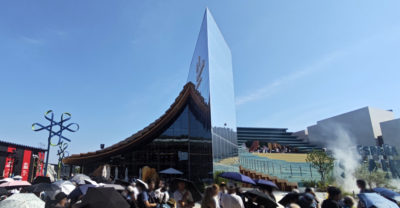 中国パビリオンは見た目でなんとなくわかりやすい(笑)。場所が悪いせいか、本来横長で見応えありそうな建物ですが、横からしか見れない残念仕様w。右側の白い建物はクゥエートパビリオン。