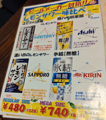 2軒目なのでほぼお酒ばかり。このお店、色々な会社のレモンサワーを取りそろえているらしい。コレ以外にも生レモンサワーとか種類が豊富でした。メガサイズで飲み比べてみました(笑)。個人的には、このビール会社4社ならサントリーが好みでした。でも、ベストはお店の生レモンサワーだったりします(笑)。