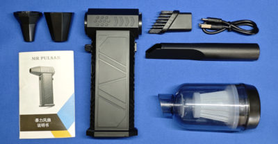 コチラが同梱品。本体以外に送風口に装着するノズルが2種類、説明書、A to C な USB ケーブル、そしてオプションなお掃除キット(集塵ポット、ノズル、先端ブラシ)も付けました。SKU としては、掃除キット無しが一番安く、更に専用ケースが付いたもの、更に集塵フィルターの予備が付いたものがありました。エアダスター代わりなら一番安い SKU で良いのですが、エアダスターで飛ばしたホコリとか後で集めるならお掃除キットがあった方がイイかな、と考えました。