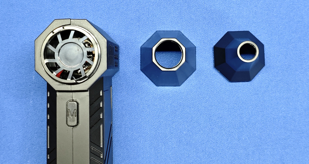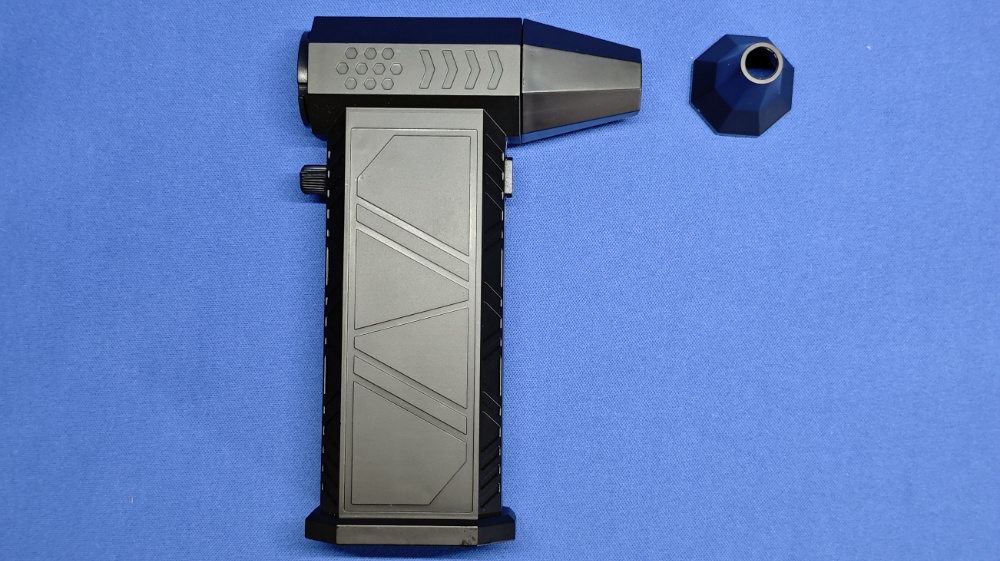 本体はグリップ部分に2本の21700バッテリーが入っているらしく、コンパクトな見た目とは裏腹にズッシリした感じ。送風口につけるノズルは、差し込んで回転させて固定します。穴の大きさが異なる2種類が付属。送風側のボタンが ON/OFF の切り替えで、押し続けると風が出るというわけではないトグル方式。反対側の吸入口の下にあるボリュームで風量を調節できます。
