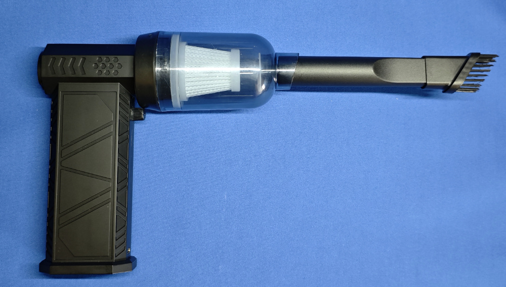 掃除キットを装着すると、こんな感じになります。送風はスゴイ強力な感じでしたが、吸引力はホドホドな感じ。ちょっとしたハンディ掃除機と同等程度な気がします。この集塵カップは単にフィルターがあるだけ。サイクロンになってたらな・・・なんて思いますが、さすがにそれは望み過ぎですかね(笑)。