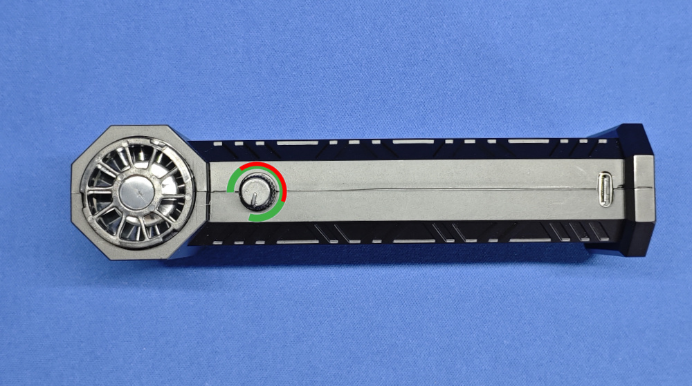 コチラが吸気口側。グリップ下側に充電用の Type-C ポートがあります。ボリュームツマミは、写真に付与した図の緑色部分のレンジで動かすことができるのですが、実際に風量が変化するのは赤いレンジという、非常に狭い範囲。ミニマム方向(本体立てて12時の方向)から時計回りに2時の方向位までは、ファンは動きません。動き始める位置に来ると、既に結構な強風で、7時の方向位でピークに達して、それ以上にしても風力は変化しない感じ。