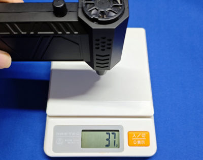 一番小さな口径のアタッチメントだと、更にパワーダウンして 37g になりました。どうやら、出力する口が狭くなることで、送り出せる風が制限されちゃっているようです。コレは手に当ててみても感じる違いでして、実はアタッチメントを何も付けない時が一番パワフルな風を感じます。