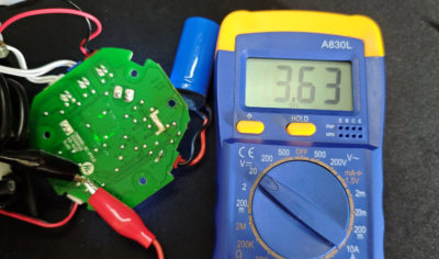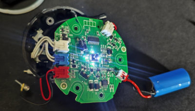 ナカミを取り出した状態で全て結線してから動作確認。LED のインジケーターは点灯するものの、モーターは回転する気配はない状態。