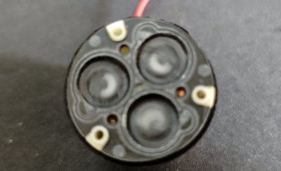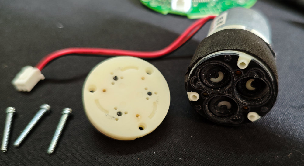 ネジ3本を外すと、プラスチックの部品が外れまして・・・ポンプのシリンダーっぽい部分が露わになりました。3本のシリンダーはシリコンっぽい部材で覆われてて、モーターの回転運動がこのシリンダーの上下運動に変換されて、空気を押しだしたり引き込んだりするようです。開いてみてわかったのですが・・・このシリンダー内が汚れています。どうやら、本来吸い込んではいけない水分(コーヒー粉末含む)を吸い込んでしまったようです。