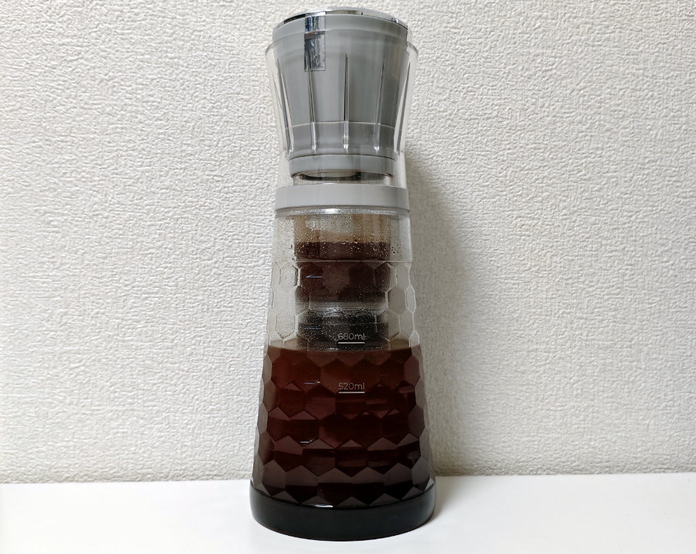 そんなわけで、復活したメインユニットを使ってコーヒー抽出です。ちゃんと動作してくれてるっぽいです。稼働させると、まずは空気を吐き出して、フィルター内のコーヒー粉部分にある水分をボトル内に吐き出します。その後、空気を吸引して水分を吸い上げて、フィルターを通して上部のカップ内に溜めて・・・ある程度溜まったら、今度は吐き出してボトル内に水分を出す・・・というのを繰り返します。