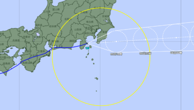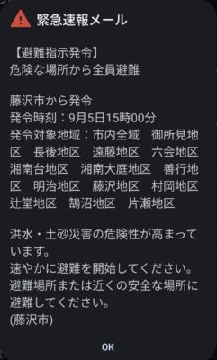 割と中心が近かった15時の予報円がこんな感じ。そんな15時ちょうどに、またしても我が家のスマホが一斉に鳴りました。