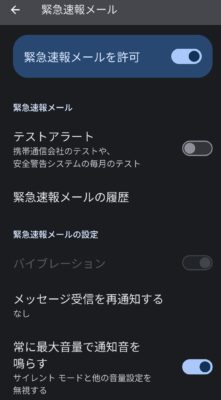 とりあえずスマホの緊急速報の音が心臓に悪いので・・・メイン端末のみ鳴らすようにして、他のサブ端末は音量設定に従う(普段バイブのみにしているので、バイブだけになるハズ)設定に変更しておきました。・・・が、コレができるのは Android 端末だけ。iPhone では音量を調整することもできません。イヤ、似たような設定の「常に警報音を鳴らす」というスイッチをオフにして、消音モードにすれば音は鳴らなくなるらしいんですが・・・消音じゃなくて、他の通知音の設定に従って欲しいんですよね。あと、緊急速報の履歴が見れないのも不便ですなぁ。この手の安全に関する設定は、各社で統一して欲しいな~。