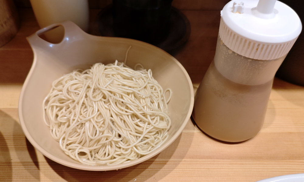 そんなわけで、予定外に替え玉(100円)を追加発注。カエシも同時に出してくれました。1杯目のスープが少な目だったので、替え玉入れたら全然スープに浸からない状態。カエシ入れて増やしてみようとしましたが、味が濃くなる(というより、塩味ブーストが強い感じな)ので、割りスープも欲しいトコロ。