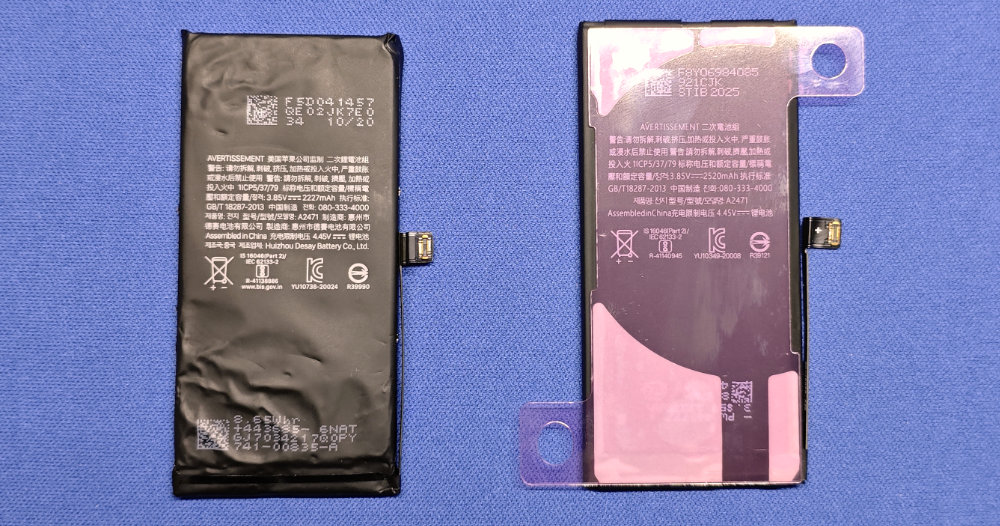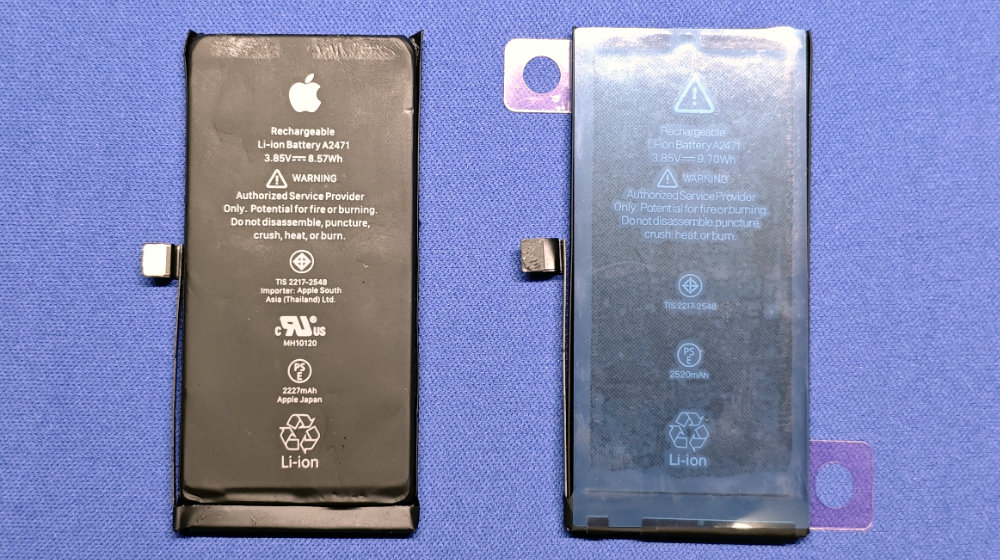 右側が9月に入手していた互換バッテリー。元々装着されいてた純正品は 3.85V/8.57Wh という記載ですが、互換品は 3.85V/9.70Wh という表記。PSEマーク下も純正の 2227mAh に対して 2520mAh という表記。もしかしたら、純正よりも大容量なのかもしれませんが・・・購入したショップではハイキャパ品は売ってなくて、付表でも 2227mAh と書かれています。まぁ、たとえハイキャパ品だったとしても互換品なので実利用時の容量は期待しないのが正解でしょう(笑)。